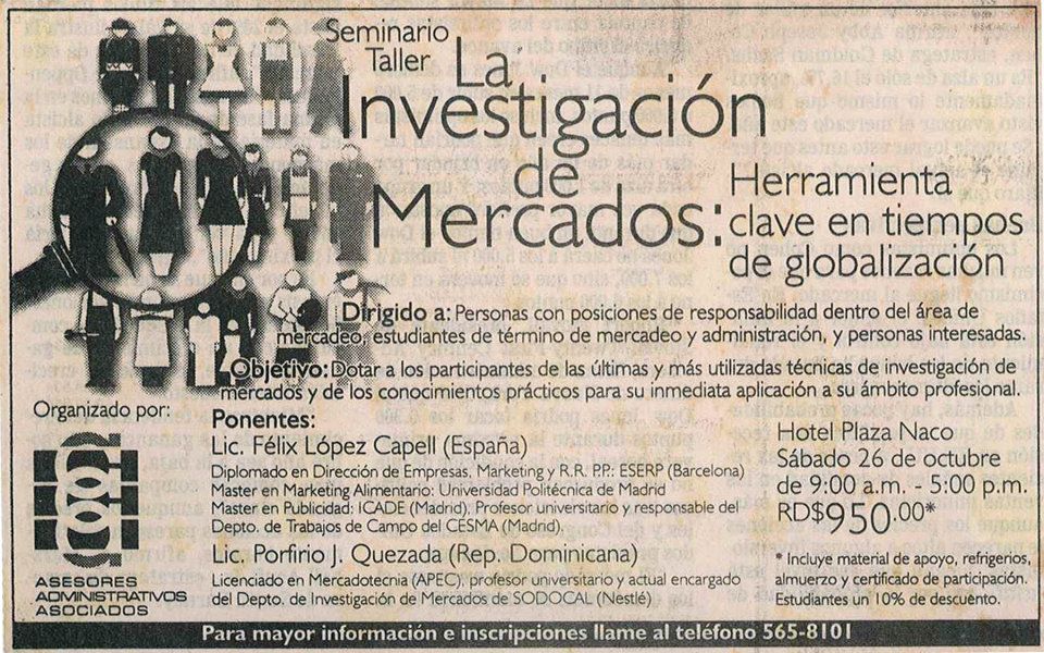 Un año después de volver a Santo Domingo al terminar su máster, me contactó por email para plantearme dar un seminario en su país sobre Investigación de Mercados. Me apetecía mucho la propuesta ya que llevaba tiempo dando clase sobre el tema. Vino a Madrid, cerramos el programa y en octubre del 96 estaba volando a Santo Domingo para compartir además cartel con Porfirio Quezada, Director de Investigación de Nestlé en ese entonces.