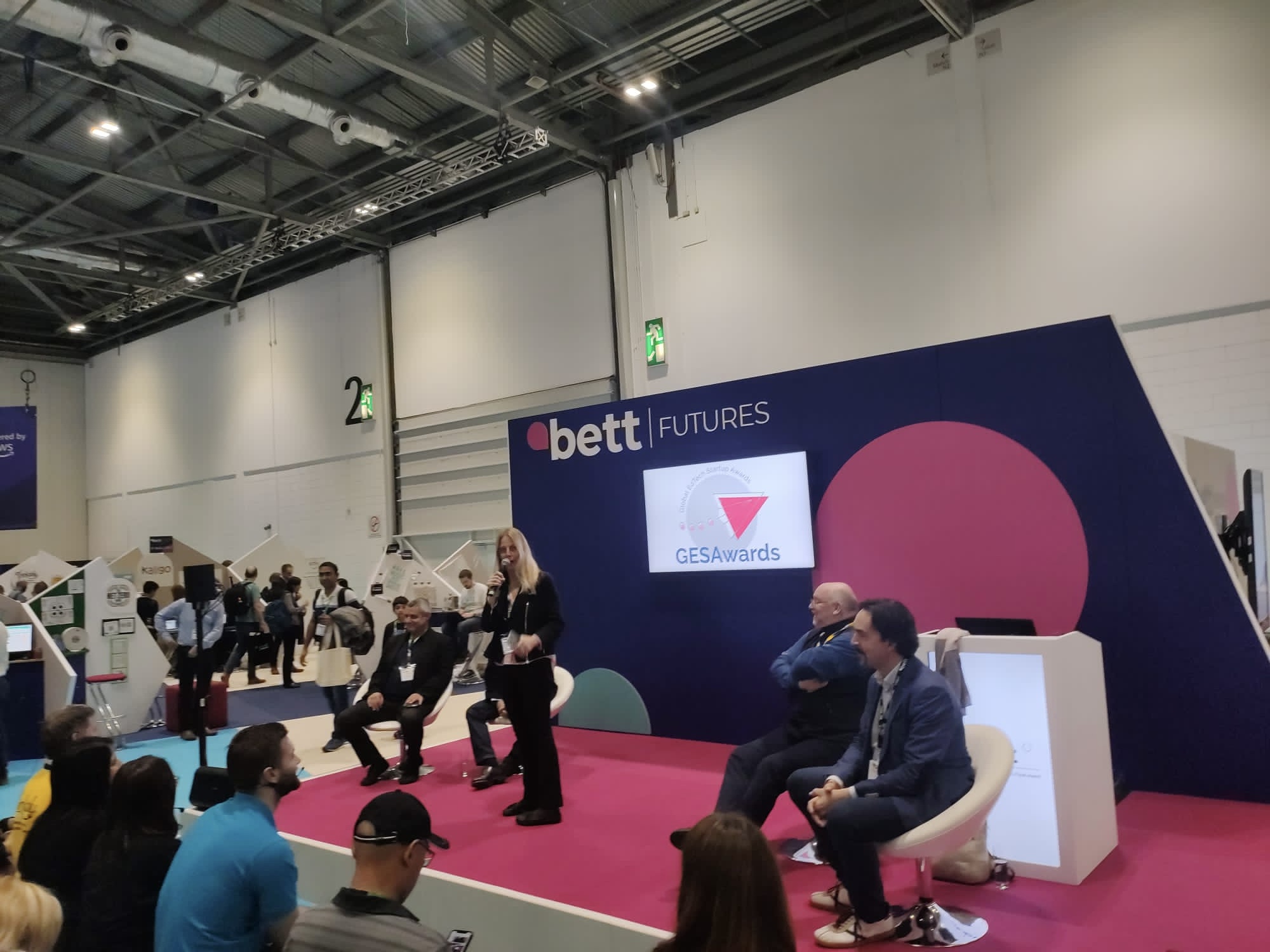 El norte reúne en la parte derecha todos los pabellones internacionales: Japon, Korea, Emiratos, Holanda, Hungria, Francia, Alemania, Estonia y muchos más. En la zona central soluciones de software dominados por dos super stands de Microsoft, Dell, y más pequeños Canva y Smart y ODILO. Pero mi zona favorita y donde pasé los 3 días, BETT Futures en azul claro. Ahí se concentraban más de 40 startups y un escenario para pitches y conferencias del sector Edtech.